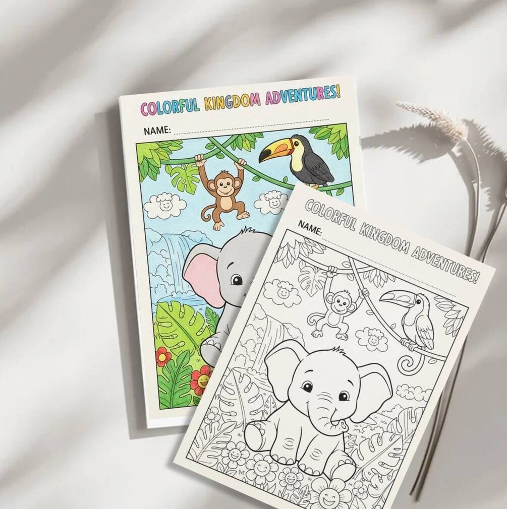 Bring the jungle to life with this adorable children’s coloring book! 🐘🦒🐵
